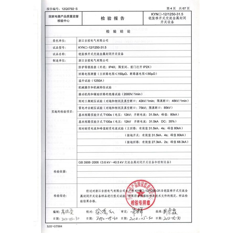 戶內(nèi)交流箱型固定式金屬封閉開關(guān)設(shè)備檢驗(yàn)報(bào)告